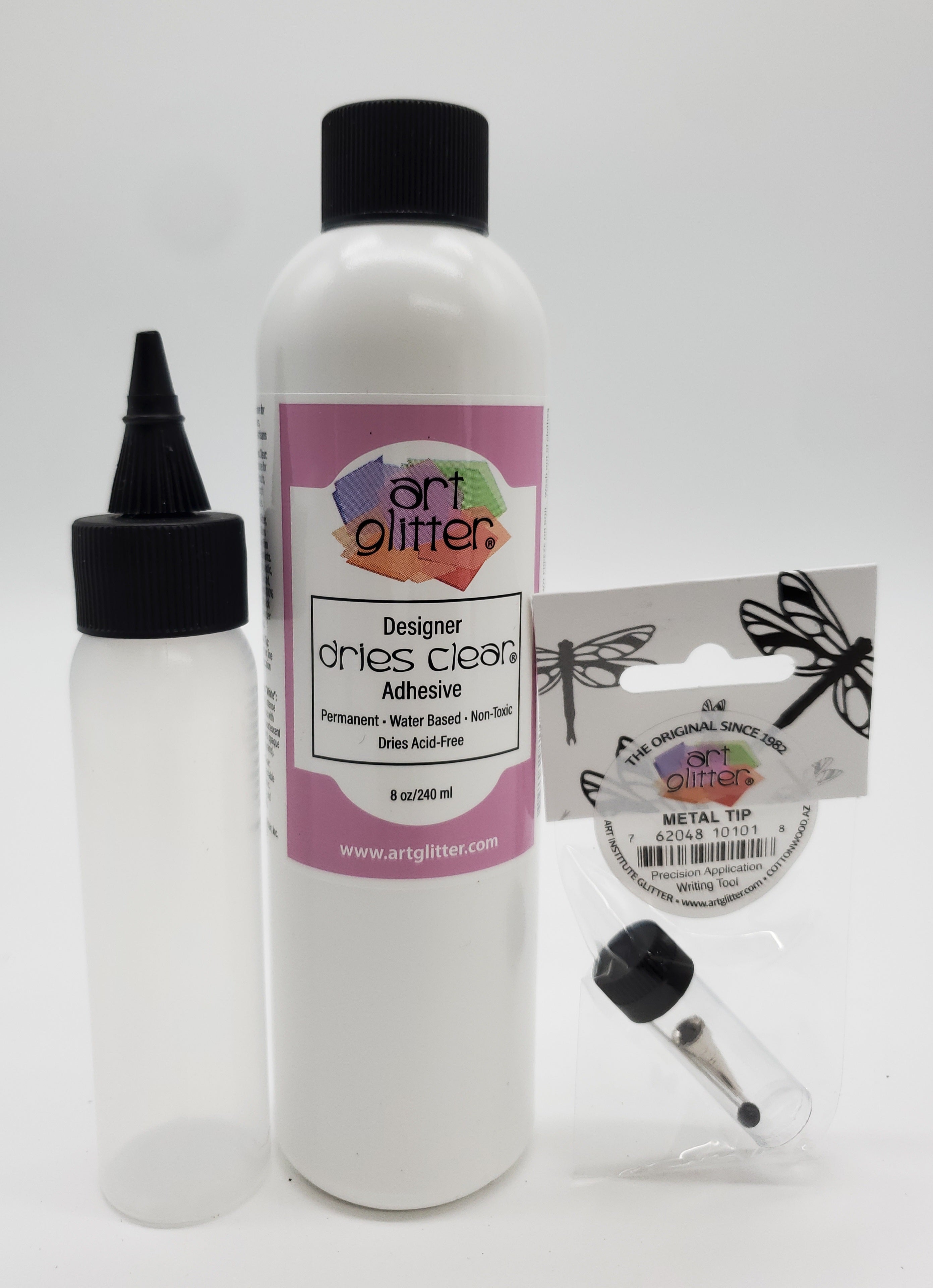 Designer Dries Clear Adhesive is an industrial strength, non-toxic, water based adhesive originally designed for glitter and paper applications.