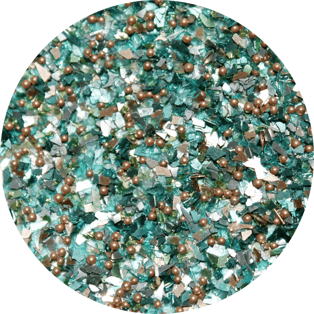 Our Gala Glitz Teal is a glitter mix of aquamarine shards with some gold beads.