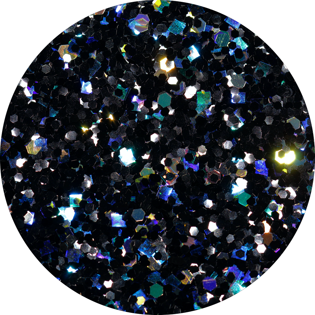 This majestic glitter starts with a deep black base and adds a dash of silver...