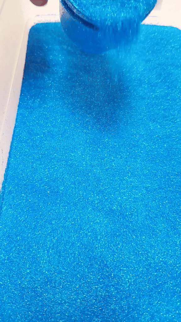 Spread a little glue on your desired surface and shake or pour glitter over the top for even and complete coverage. Greeting cards, scrapbooks, and art projects will dance with color and texture!
