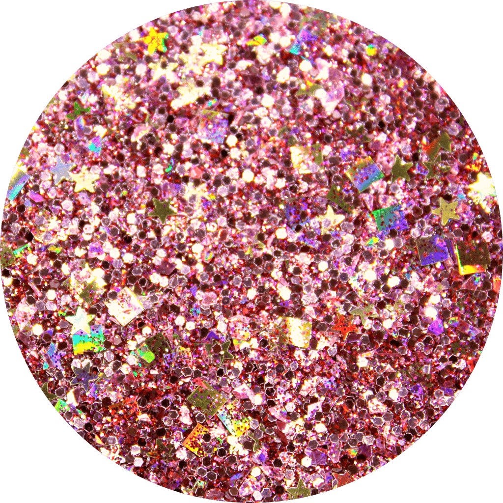 This charming and feminine glitter mixes sweet baby pinks, warmer rosy pinks and holographic gold stars and squares that you won’t be able to stop talking about.