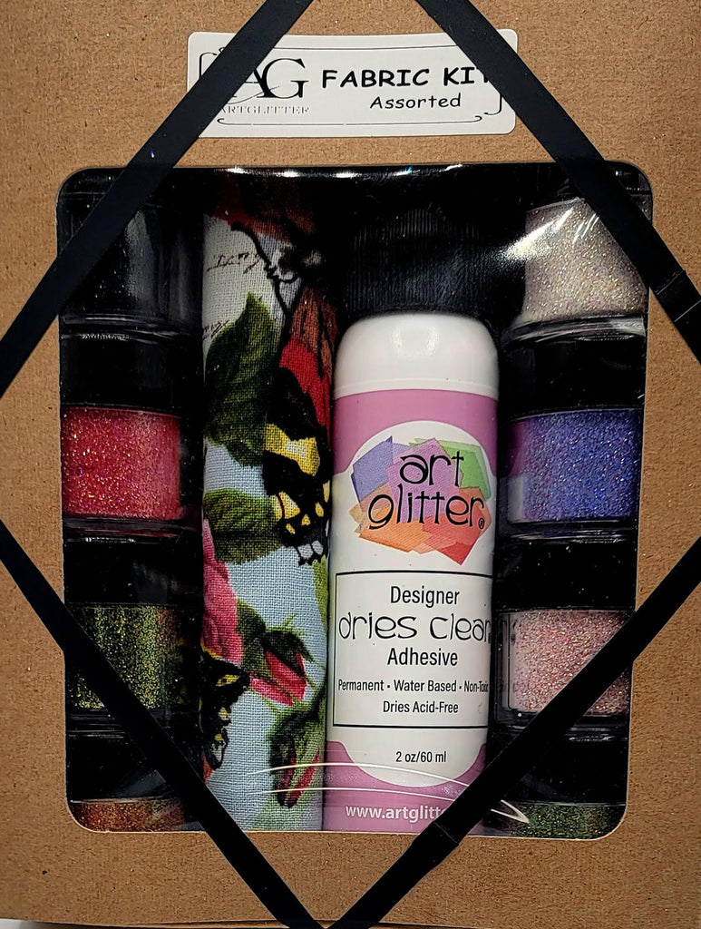 Kit includes Fabric Panel 10 1/2 x 13 inches, 8 - 1/4 oz. jars of glitter matched to the panel, 2 oz. Designer Dries Clear Adhesive, Glitter Spoon, Fine Metal Tip Attachment, Wiping Cloth, Noodgers and Instruction sheet.