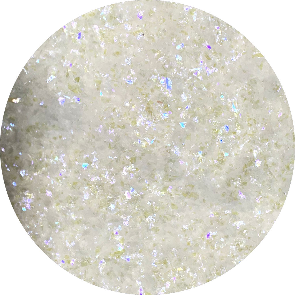 This stellar glitter flake is a white transparent color with soft yellow hues and a vibrant lavender iridescence.
