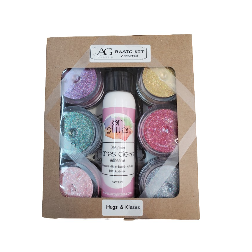 6 - 1/2 ounce jars of glitter in Berren, Tide Pool, Baby's Breath, Flax, Magnolia and Glacier. 1 Pee Wee Vial in a coordinating color. 1 Fine Writing Metal Tip, 2 ounce Designer Dries Clear Adhesive, Glitter Spoon, 2 Noodgers, !- Cloth, Butterfly to decorate and Instruction Sheet.