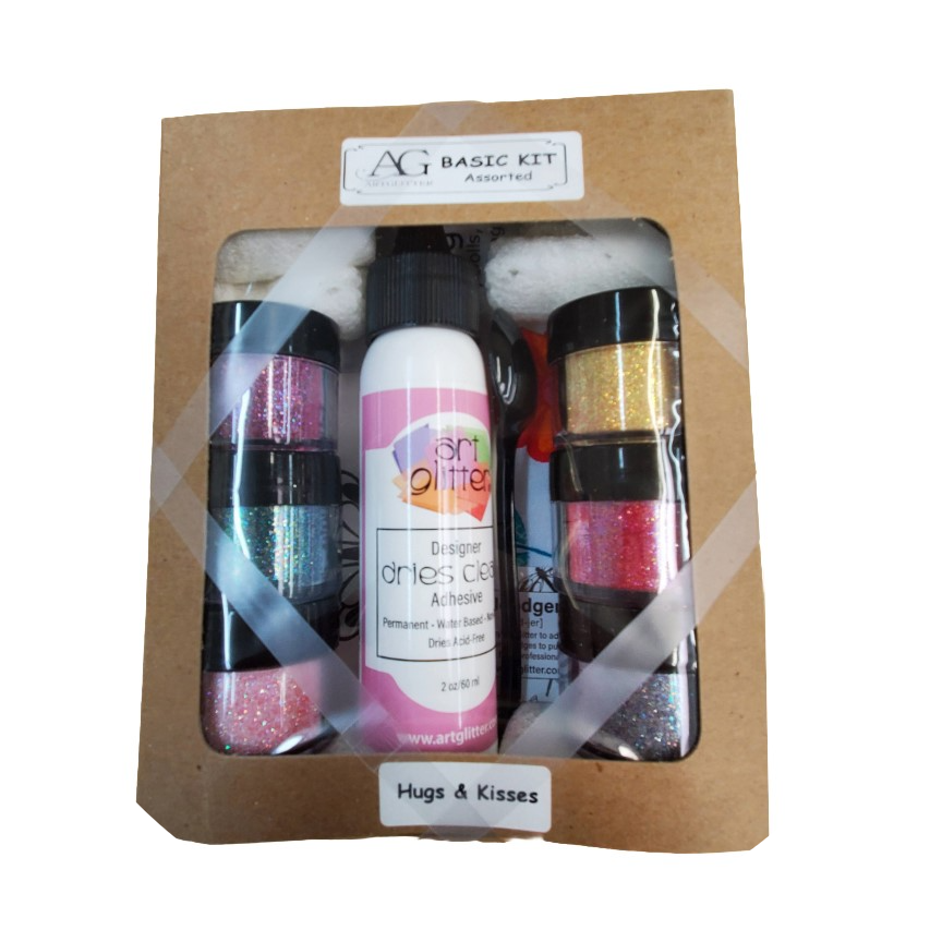 6 - 1/4 ounce jars of glitter in Berren, Tide Pool, Baby's Breath, Flax, Magnolia and Glacier. 1 Pee Wee Vial in a coordinating color. 1 Fine Writing Metal Tip, 2 ounce Designer Dries Clear Adhesive, Glitter Spoon, 2 Noodgers, !- Cloth, Butterfly to decorate and Instruction Sheet.